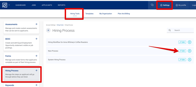 1. Navigate to Settings > Hiring Tools > Hiring Process.