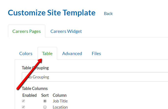 The final essential configuration option is choosing how your jobs are filtered on your careers page. To access this, click Customize Careers Widget at the bottom of the Company page. From here, head to the Table tab.